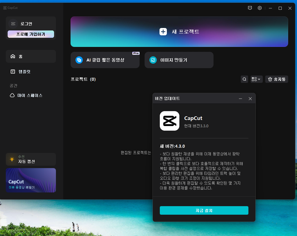 1-7. 최신버전 캡컷이 설치 완료! 업데이트 후 재시작하면 아까 설치 마지막에 한국어로 설정이 잘되셨다면